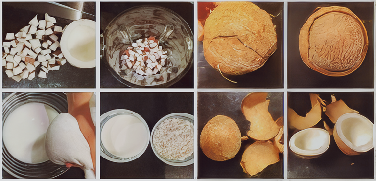 Rendimento: 750 ml (5 potinhos de 150 ml) de leite de coco e 2 potinhos do coco ralado (o que sobra quando coa o leite)